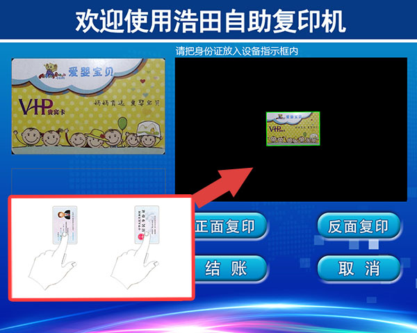 浩田自助二代身份证打印机可以进行二代身份证快速复印、扫描复印和读卡器复印,可以微信、支付宝、投币支付,投放在地铁、机场、车站、办证大厅、银行、学校等人流密集地
