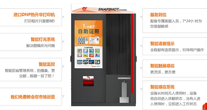 2、自助式证件照摄影系统是全自动运行的,24小时工作,无需有人值守,用户可以自主完成照片的拍摄、指纹采集、缴费、照片打印,可以使用现金、支付宝、微信、银联进行缴费。自助式证件照摄影系统操作简单,全程都有语言提示。