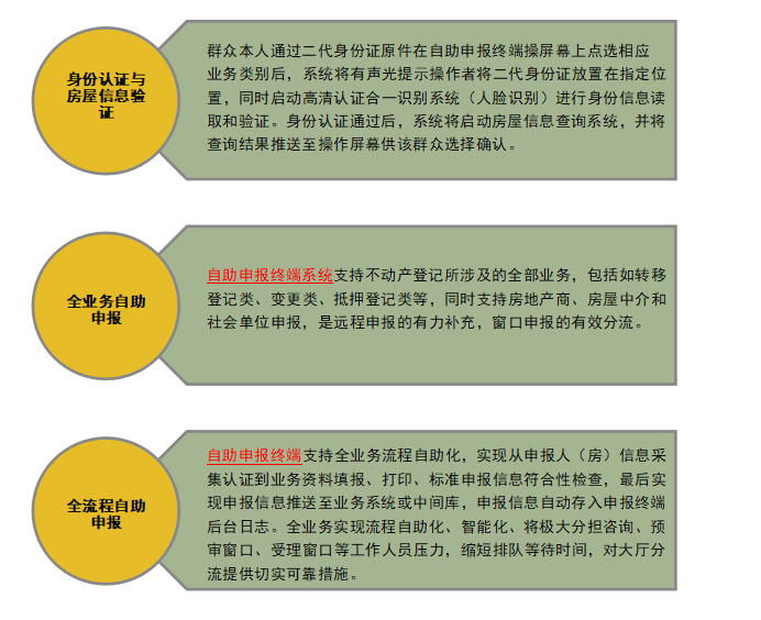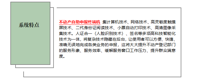不动产自助申报系统是专门针对买卖双方自行申请房屋交易或抵押变更等不动产登记业务的自助申报类系统。通过不动产登记自助终端,业务办理人员可以自助完成房产交易、抵押、房产、名下等不动产登记业务,通过身份证识别,人脸识别,系统可自动获取身份信息,信息核对,智能审批、资料打印、证明打印等功能。整个过程只需几分钟,真正做到业务智能化一站式高效的服务,大程度提高办事效率,提升大家的办事满意度与好评,适用于政务大厅、银行、房产中心等机构。不仅如此,自助终端机支持24小时营业,这对于上班群体来说,是一大便捷,在时间上能自由安排。